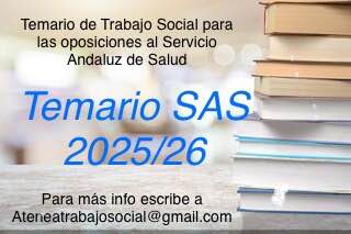 Actualmente ofrecemos el Temario Completo para Trabajo Social de la Junta De Andalucía, El Temario Completo para Trabajo Social del SAS (Sistema Andaluz de Salud) y el Temario de Trabajo Social en Instituciones Penitenciarias para personal Laboral.